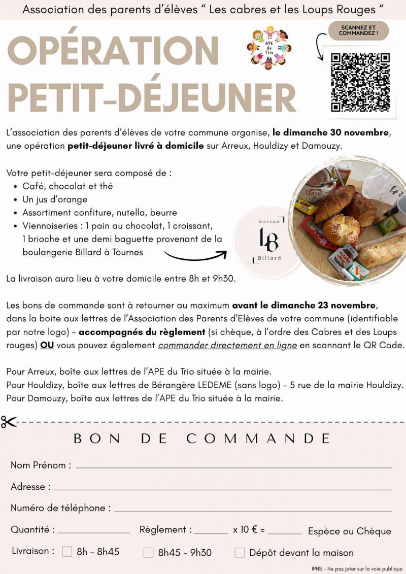 ou via le QR code sur le flyer qui a été distribué dans chaque boite aux lettres des trois communes : Arreux, Houldizy, Damouzy. Cette action servira à financer un beau projet de l'école : la venue d'un cirque et une initiation pour tous les élèves du Trio